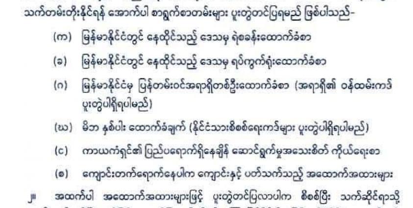 ထုတ်ပြန်ချက်မှာ မြန်မာနိုင်ငံမှာ နေထိုင်တဲ့ဒေသက ရဲစခန်းထောက်ခံစာ၊ ရပ်ကွက်ထောက်ခံစာ၊ ပြန်တမ်းဝင်အရာရှိတစ်ဦးထောက်ခံစာ၊ နိုင်ငံရေးစိစစ်ရေးကတ်ပါတဲ့ မိဘထောက်ခံစာ၊ ကာယကံရှင် ပြည်ပရောက်နေချိန် ဆောင်ရွက်မှုအသေးစိတ် ကိုယ်ရေးစာ၊ တက်ရောက်တဲ့ ကျောင်းနဲ့ ပတ်သက်တဲ့ အထောက်အထား စတဲ့ အချက် ( ၆ ) နဲ့အတူ ပုံမှန် ပတ်စပို့သက်တမ်းတိုးချိန်လိုအပ်တဲ့ စာရွက်တွေကိုပါ ယူဆောင်လာရမယ်လို့ ဆိုပါတယ်။