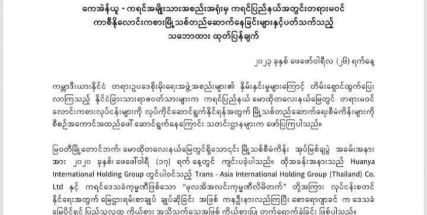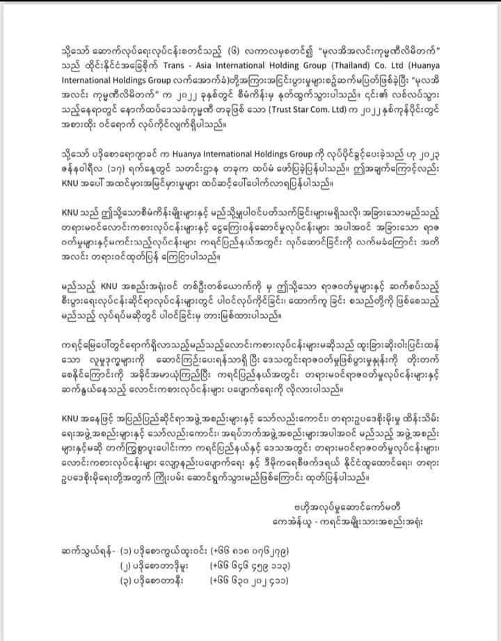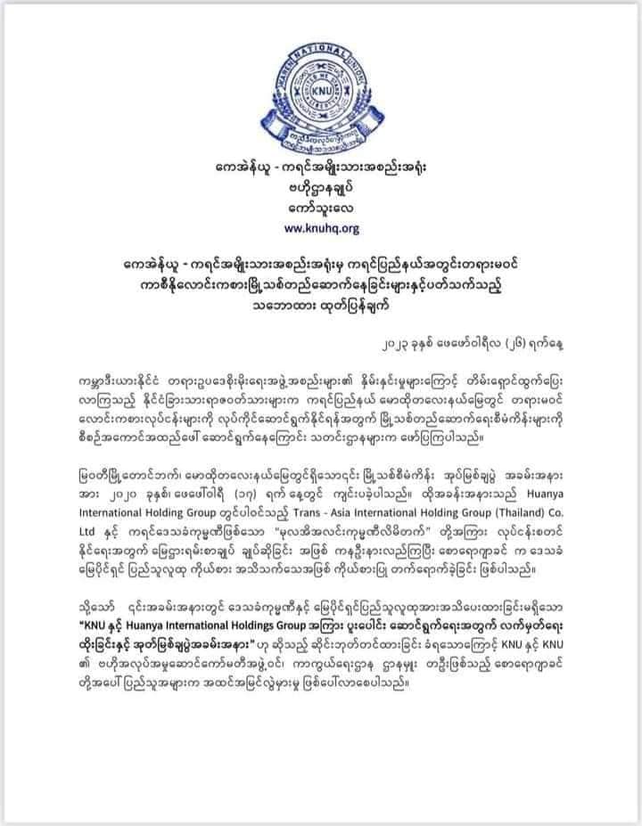 တရားမဝင်လောင်းကစားလုပ်ငန်းတွေပါဝင်တဲ့ တရုတ်မြို့သစ်စီမံကိန်းတွေမှာ KNU အနေနဲ့ ပါဝင်ပတ်သက် ခြင်း မရှိသလို အခြားသော ဘယ်တရားမဝင်လောင်းကစားလုပ်ငန်း၊ ငွေကြေးဝန်ဆောင်မှု လုပ်ငန်းတွေအပါအဝင် အခြားသော ရာဇဝတ်မှုမကင်းတဲ့လုပ်ငန်းတွေကို ကရင်ပြည်နယ်အတွင်း လုပ်ဆောင်မှုကို လက်မခံကြောင်း KNU ဗဟိုက ပြီးခဲ့တဲ့ ဖေဖော်ဝါရီလ(၂၆)ရက်နေ့ရက်စွဲနဲ့ ထုတ်ပြန်ထားပါတယ်။