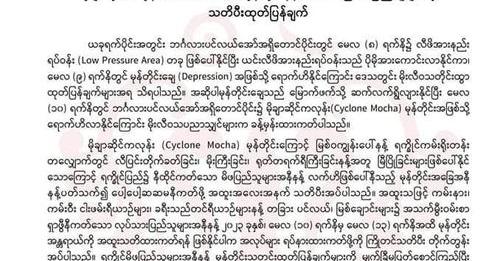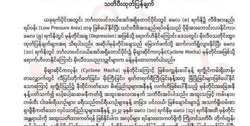 ၎င်းထုတ်ပြန်ချက်ထဲတွင် ဘင်္ဂလားပင်လယ်အော်အရှေ့တောင်ပိုင်း၌ လေဖိအားနည်း ရပ်ဝန်းတစ်ခု ဖြစ်ပေါ်နေ ပြီး ၎င်းလေဖိအားနည်းရပ်ဝန်းသည် မေလ ၉ ရက်နေ့တွက် မုန်တိုင်းငယ်အဖြစ်သို့ ရောက်ရှိနိုင်ပြီး မေလ ၁၀ ရက်နေ့တွင် အားကောင်းသောဆိုင်ကလုန်းမုန်တိုင်း (Cyclone Mocha) ဖြစ်ပေါ်နိုင်သည်ဟု မိုးလေဝသပညာ ရှင်များက ခန့်မှန်းထားကြောင်း ဦးစွာဖော်ပြသည်။