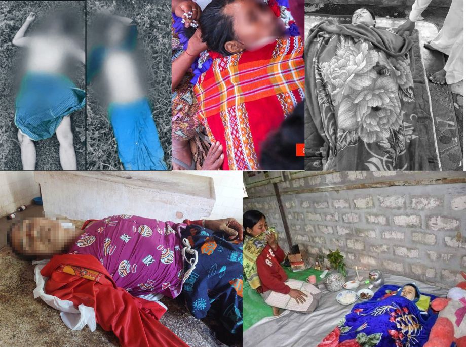 “ဖမ်းဆီးသတ်ဖြတ်ပြီး မီးရှို့တာ တော်တော်များတယ်။ ဖမ်းဆီးသတ်ဖြတ်ခြင်းကြောင့် သေတဲ့ဦးရေက တော် တော်များတယ်။ အများဆုံးထဲ သွားကျတယ်။ ဖမ်းဆီးပြီးသတ်ဖြတ်တဲ့ ပုံစံထဲမှာ မီးရှို့သတ်တာ ရှိတယ်၊ သား ကို ပစ်သတ်တာရှိတယ်။ လင်ကိုပစ်သတ်တာ ရှိတယ်။ ပြီးတော့မှ အစုအလိုက်အပြုံလိုက် မီးရှို့ပစ်တာရှိတယ်။ ဖမ်း ဆီးညှင်းဆဲ သတ်ဖြတ်တာပေါ့။ အဲဒီဟာက အဆိုးဝါးဆုံး လူ့အခွင့်အရေး ချိုးဖောက်မှု တစ်ရပ်ဖြစ်တယ်။ ပြီး တော့ လမ်းသွားလမ်းလာတွေကို ပစ်ခတ်တာ၊ စစ်ရှောင်တွေရှိတဲ့ စခန်းတွေ၊ ကျေးရွာတွေထဲ ပစ်ခတ်တယ်။ ဗုံး တွေ၊ လေကြောင်းပစ်ခတ်မှုတွေကြောင့် သေဆုံးတာ ဒုတိယအများဆုံးဖြစ်တယ်။ ဒါကစစ်ကောင်စီကနေ မကျုး လွန်သင့်တဲ့ အရပ်သားတွေအပေါ် ကျူးလွန်တဲ့အရာတွေဖြစ်တယ်။ အဲဒါက ရာဇဝတ်မှုမြောက်တဲ့ ပုံစံ အဖြစ် တွေ့ရတယ်” လို့ သူက ဆိုပါတယ်။