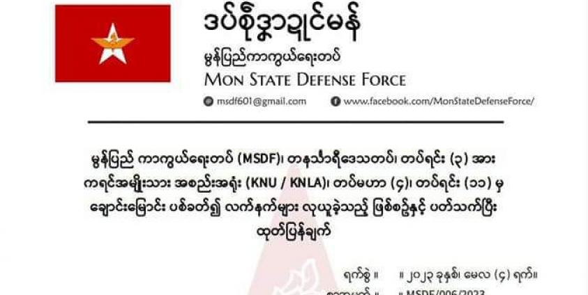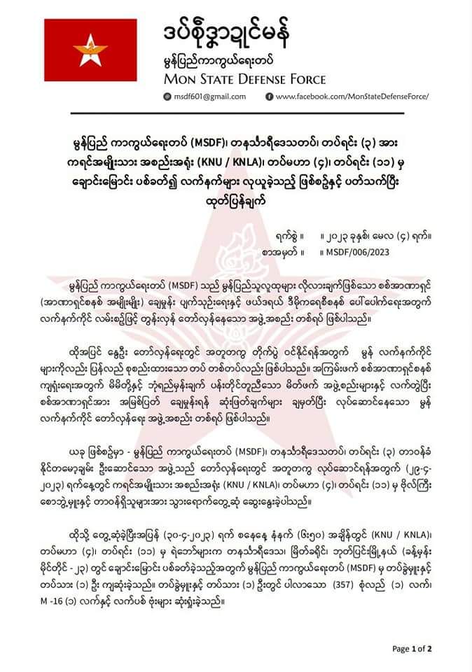 မွန်ပြည် ကာကွယ်ရေးတပ် - MSDF၊ တနင်္သာရီဒေသ တပ်ရင်း (၃) အား ကရင်အမျိုးသားအစည်းအရုံး KNU / KNLA၊ တပ်မဟာ (၄)၊ တပ်ရင်း (၁၁) မှ ချောင်းမြောင်းပစ်ခတ်၍ လက်နက်များ လုယူခဲ့သည်ဟု မေလ ၄ ရက်န့ နေ့စွဲဖြင့် ထုတ်ပြန်ချက်ထဲတွင် ရေးသားဖော်ပြထားသည်။