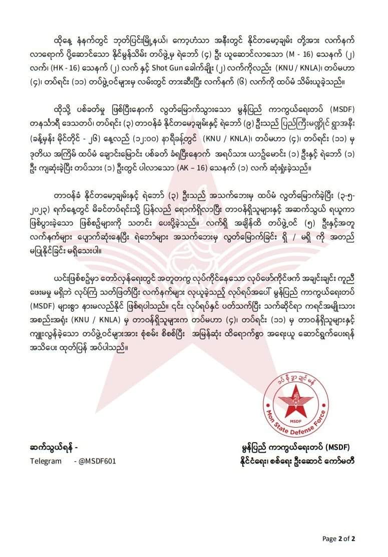 တော်လှန်ရေးတွင် အတူတကွ လုပ်ကိုင်နေသော လုပ်ဖော်ကိုင်ဖက် အချင်းချင်း ကူညီဖေးမမှု မရှိဘဲ လုပ်ကြံ သတ်ဖြတ်ပြီး လက်နက်များ လုယူခဲ့သည့်လုပ်ရပ်အပေါ် များစွာ နားမလည်နိုင် ဖြစ်ရပါကြောင်း နှင့် သက်ဆိုင် ရာ ကရင်အမျိုးသား အစည်းအရုံး (KNU/KNLA) မှ တာဝန်ရှိသူများက ကျူးလွန်ခဲ့သော တပ်မဟာ (၄) တပ်ရင်း (၁၁) တပ်ဖွဲ့ဝင်များအား စုံစမ်းစိစစ်ပြီး အမြန်ဆုံး ထိရောက်စွာ အရေးယူ ဆောင်ရွက်ပေးရန် MSDFမှ အသိပေး ထုတ်ပြန်ထားသည်။