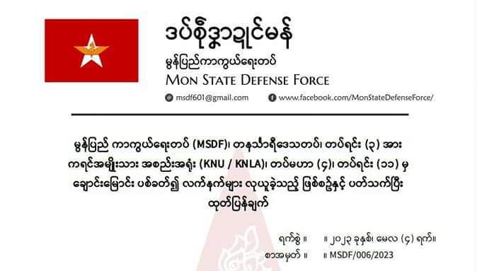 စစ်အာဏာရှင် စနစ်တော်လှန်ရေးအတွက် KNU မှ ဗိုလ်ကြီးအဆင့်တစ်ဦးနှင့် တွေ့ဆုံဆွေးနွေးပြီး အပြန် လမ်းခရီးတွင် နှစ်ကြိမ် ချောင်းမြောင်းပစ်ခတ်ခံခဲ့ရကာ လက်နက်များလည်း ဆုံးရှုံးခဲ့သည်ဟု မွန်ပြည် ကာကွယ် ရေးတပ် MSDF ၏ နိုင်ငံရေး၊ စစ်ရေးဦးဆောင်ကော်မတီက ထုတ်ပြန်ကြေငြာထားသည်။