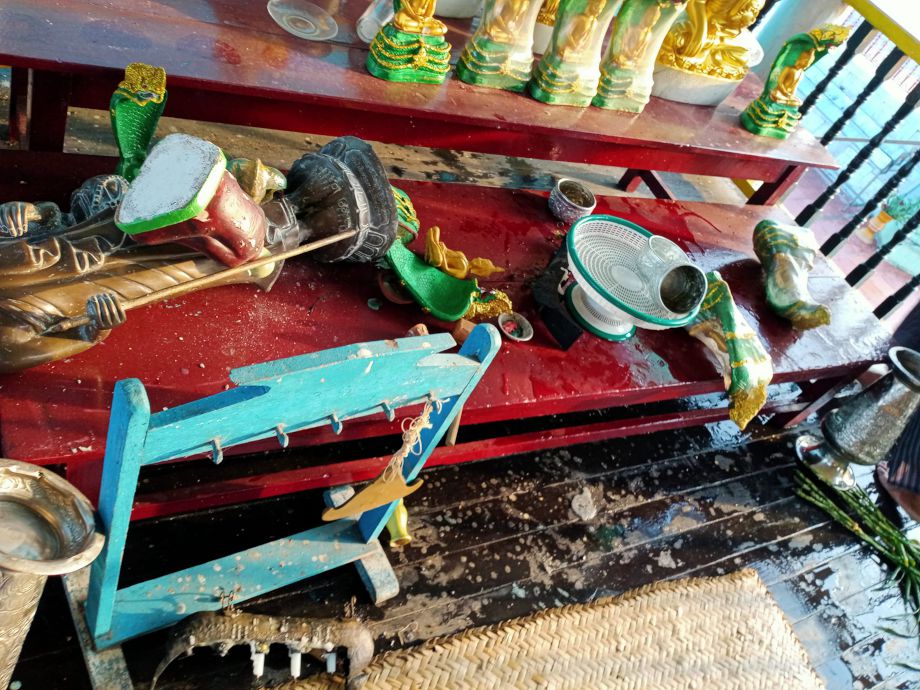 “နတ်စင်အကျော်နားလေးမှာ အက်ရာဖြစ်သွားတယ်။ ဘုရားရင်ပြင် အတက်နားလေးမှာပေါ့ တခြားနေရာတွေ ကတော့ ငလျင်လူပ်သွားတာကြောင့် ရေလွှတ်ဆောင်ပေါ်က ခုံပေါ်တင်ထားတဲ့ဘုရားတွေ အကုန်လုံး ပြုတ်ကျ ပြီး နဂါးရုံဘုရားဆူ အသေးလေး နှစ်ဆူကျိုးသွားတယ်။ ဉာဏ်တော် တစ်ထွာကျော်ကျော်လေးတွေ ရှိတဲ့ အဆူ တွေ၊ ဘုရားရင်ပြင်မရောက်ခင် ကွန်ကရစ်လမ်းလေးလည်း လမ်းပြတ်အက်ရာ ဖြစ်သွားခဲ့တယ်” လို့ ဘုရား ဂေါပက ဦးစိန်ဝင်းက ပြောပါတယ်။