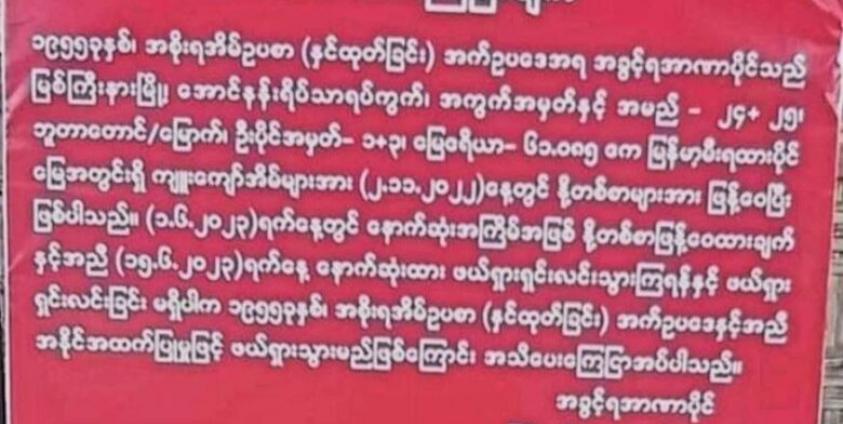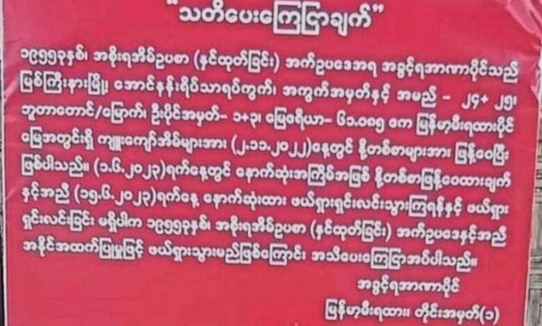 ဓါတ်ပုံ - စစ်ကောင်စီအဖွဲ့က CDM ဝန်ထမ်းမိသားစုများအား ဇွန်လ ၁၅ ရက်နေ့ နောက်ဆုံးထားပြီး အပြီးတိုင် ထွက်ခွာပေးကြရန် သတိပေးစိုက်ထူထားသည့် ဆိုင်းဘုတ်