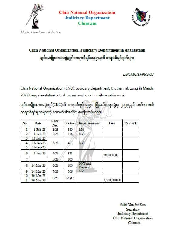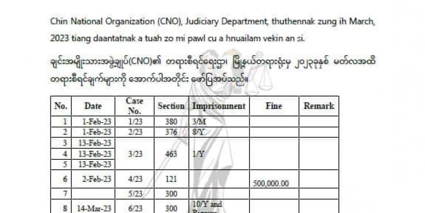 ချင်းအမျိုးသားအဖွဲ့ချုပ်/ချင်းအမျိုးသား ကာကွယ်ရေးတပ်ဖွဲ့ (CNO/CNDF) က ၎င်းတို့၏ ထိန်းချုပ်နယ်မြေ အတွင်း လူသတ်မှု၊ မုဒိမ်းမှု၊ သက်ငယ် မုဒိမ်းမှု၊ ခိုးမှု၊ အိမ်မီးရှို့မှုနှင့် မိုးယစ်ဆေးဝါး ရောင်းဝယ်မှုစသည့် ပြစ်မှု ကျူးလွန်သူများကို ပြစ်မှုဆိုင်ရာ ဥပဒေနှင့်အညီ ငွေဒဏ်၊ ထောင်ဒဏ် အသီးသီး စီရင်ချမှတ်ခဲ့သည်ဟု CNO တရားရေးဌာနက ဇွန်လ ၁၃ ရက်နေ့က ထုတ်ပြန်သည်။