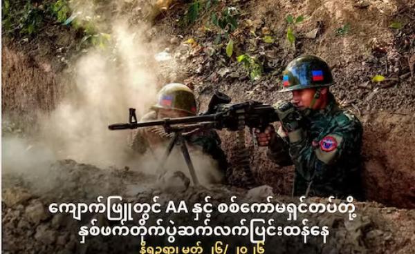 ရခိုင်ပြည်၊ တောင်ကုတ်နှင့် ပဲခူးတိုင်း၊ ပန်းတောင်းအစပ် ရခိုင်ရိုးလမ်းရှိ ညောင်ကျိုးစခန်းသို့ ထိုးစစ်ဆင်လာသည့် စစ်ကောင်စီတပ်၏...